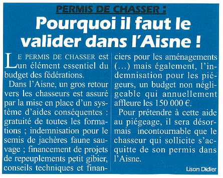 Le permis de chasser est un élément essentiel du budget des fédérations. Dans l’Aisne, un gros retour vers les chasseurs est assuré par la mise en place d’un système d’aides conséquents : gratuité des formations (permis de chasser, piégeage, sécurité, venaison …) ; indemnisation pour le semis de jachères faune sauvage ; financement de projets de repeuplements petit gibier (…) mais également, l’indemnisation pour les piégeurs, un budget non négligeable qui annuellement affleure les 150 000 €.
